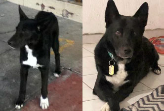 Seguía a las personas que pasaban como intentando que alguien se lo llevara a su casa, vecinos de locales comerciales lo alimentaron por unos días y dos de ellos intentaron adoptarlo pero las condiciones de vivienda no se adaptaban hasta que se le consiguió un hogar en un rancho pero es un perro sumamente temeroso y el trato ahi no fue el mejor.